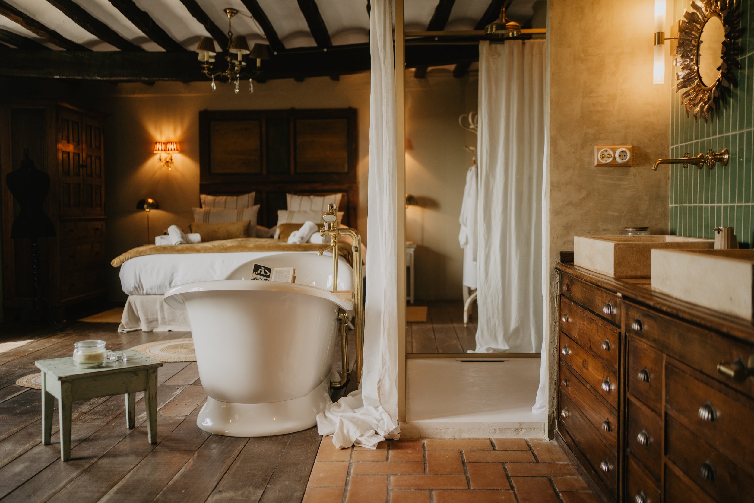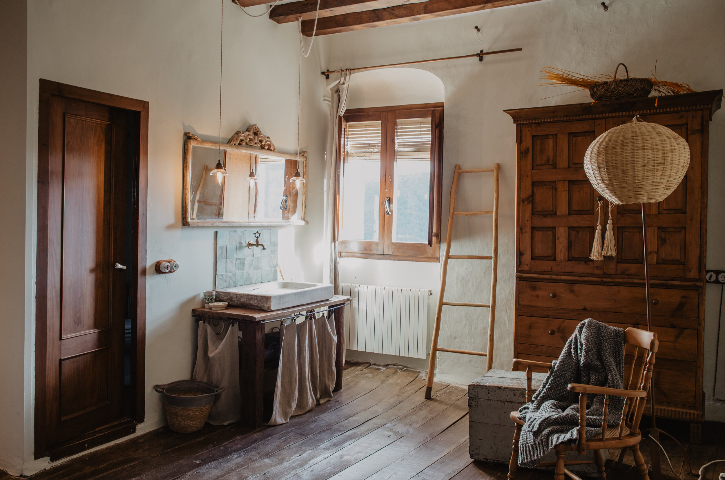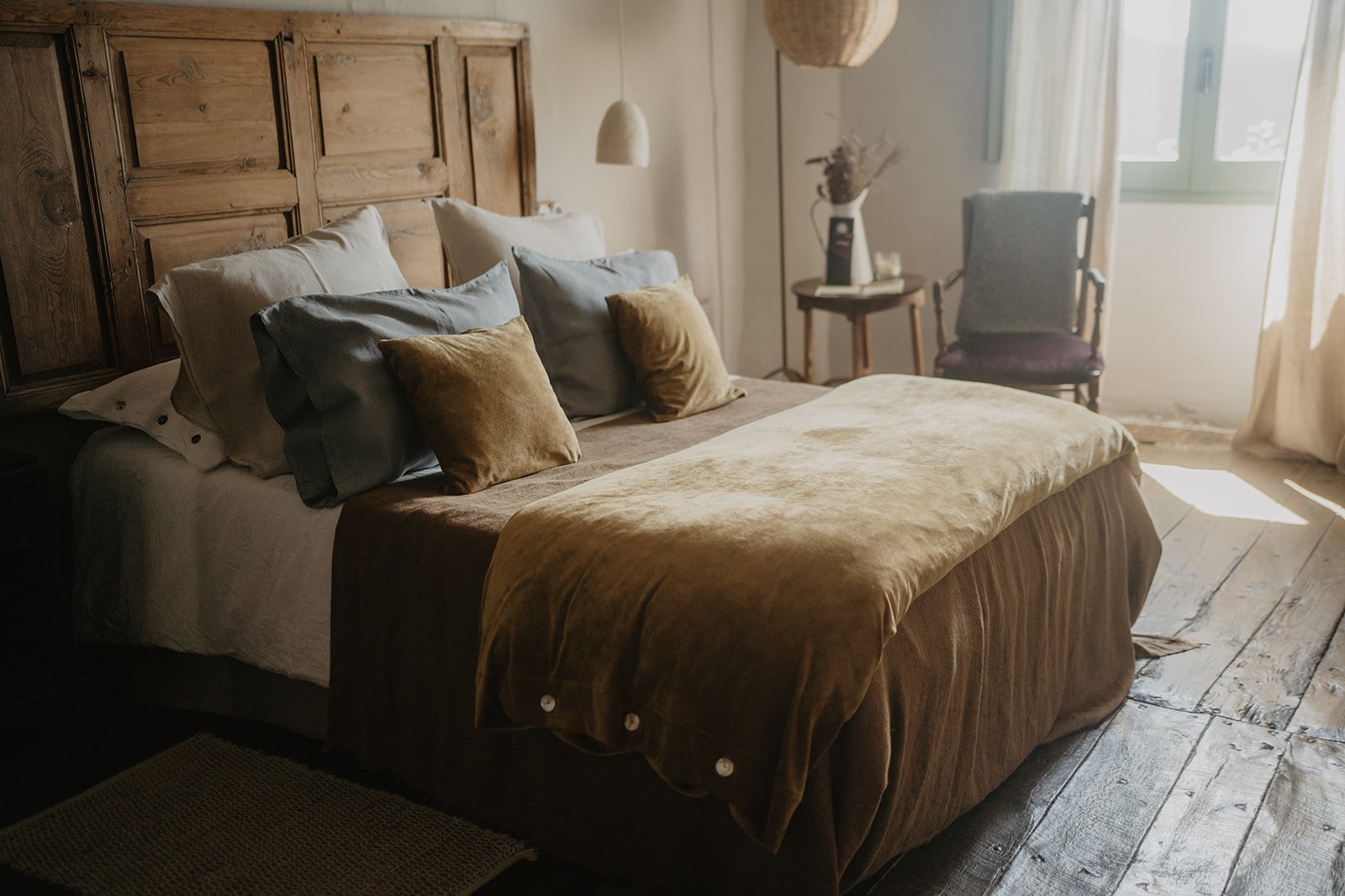 Dorm en una masia catalana del segle XIV, restaurada amb materials naturals i tradicionals com la calç i la fusta.